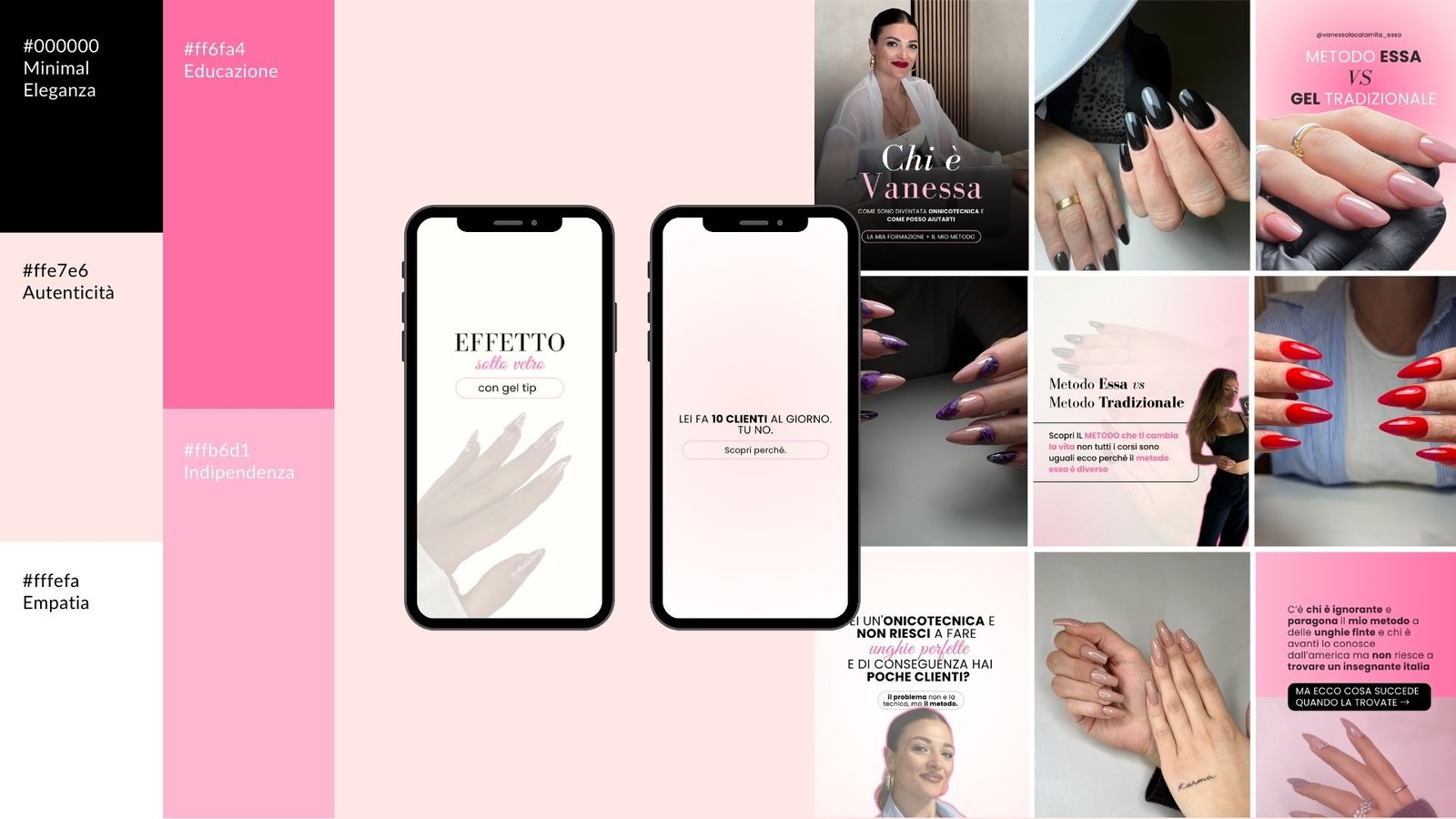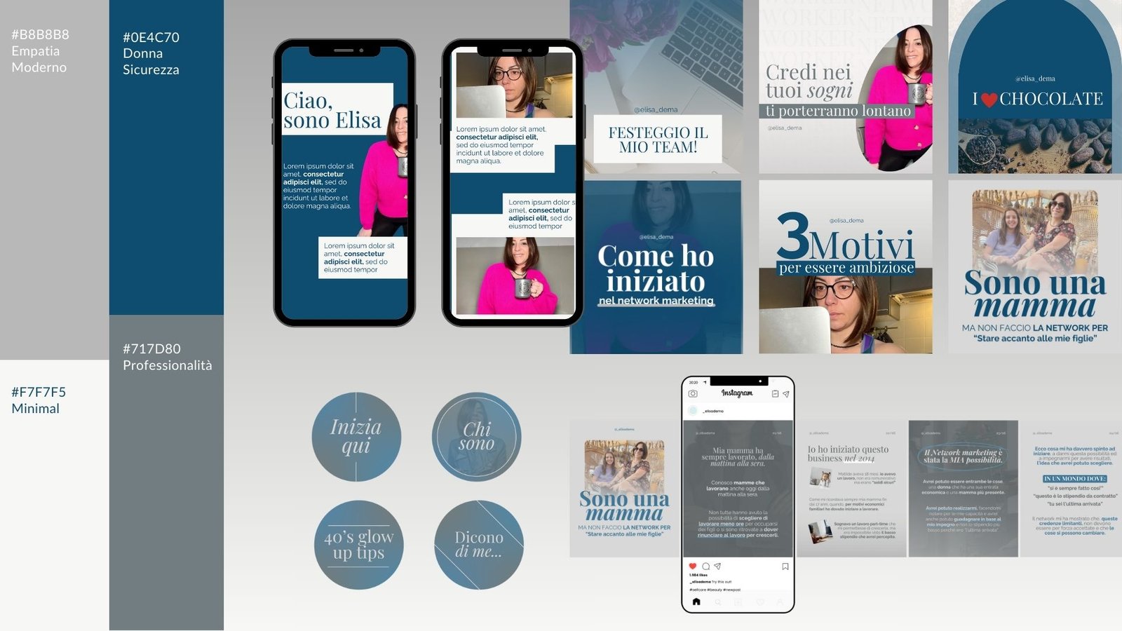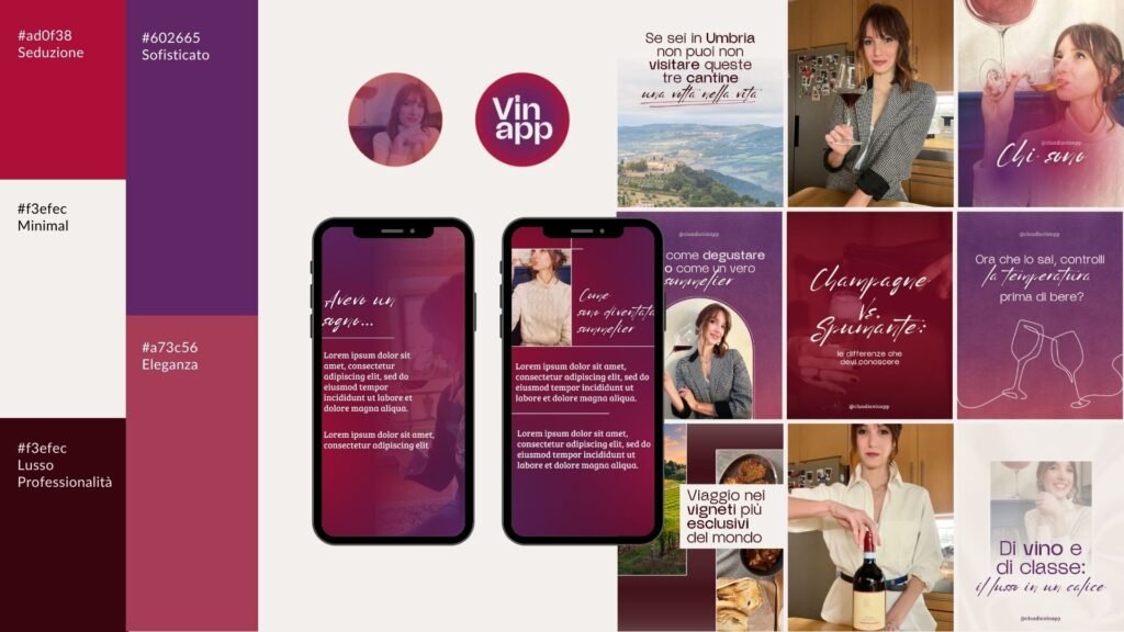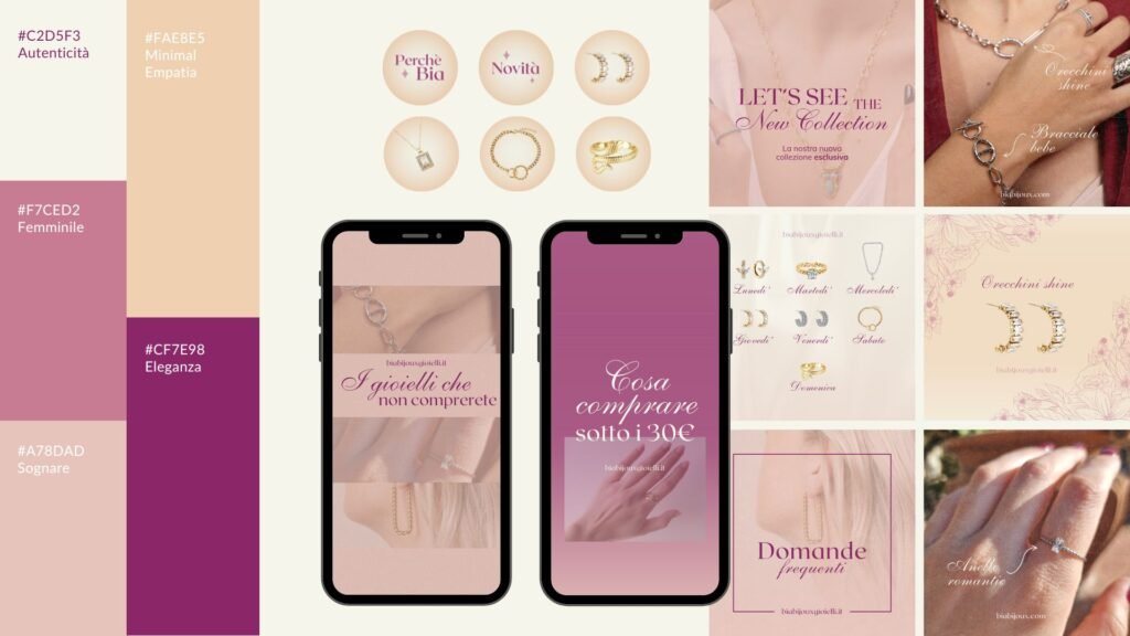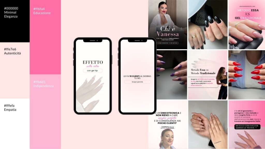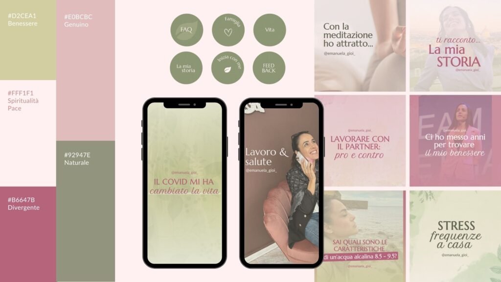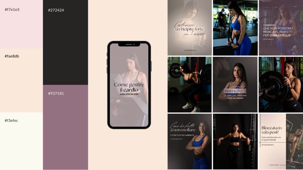 Brand identity con palette colori, font e template social personalizzati. Struttura grafica pensata per valorizzare la presenza online e mantenere uniformità visiva.