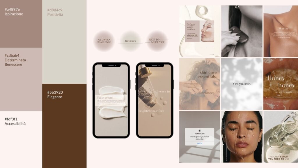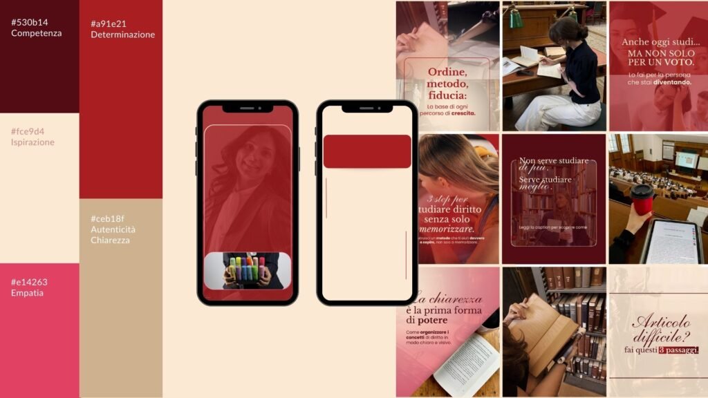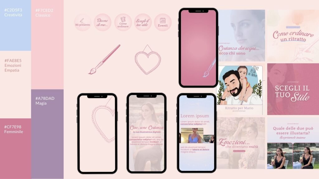 Creazione della brand identity con palette colori, font e template social personalizzati.
